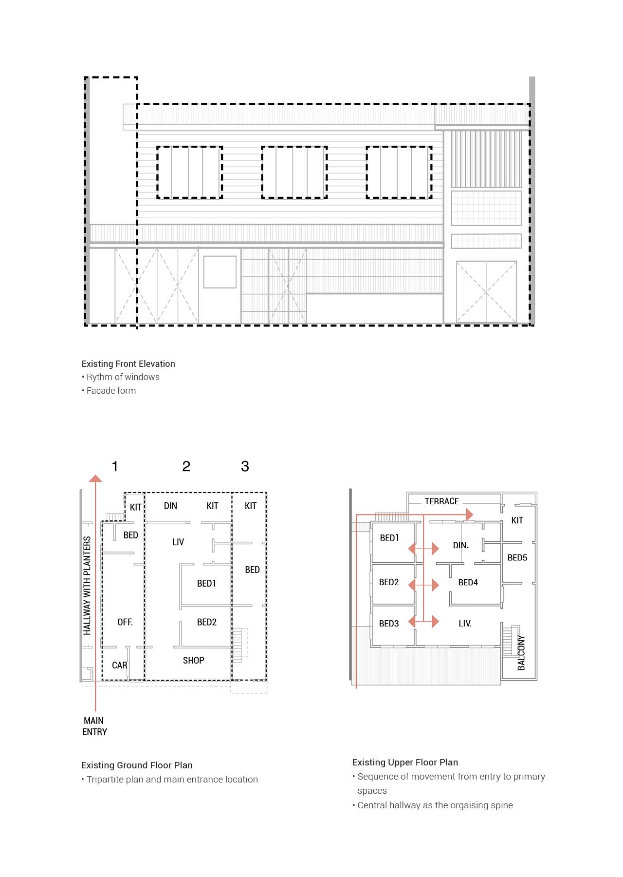 The tripartite plan and main entry are retained, with the central hallway continuing as the organising spine — preserving its sequence and procession.