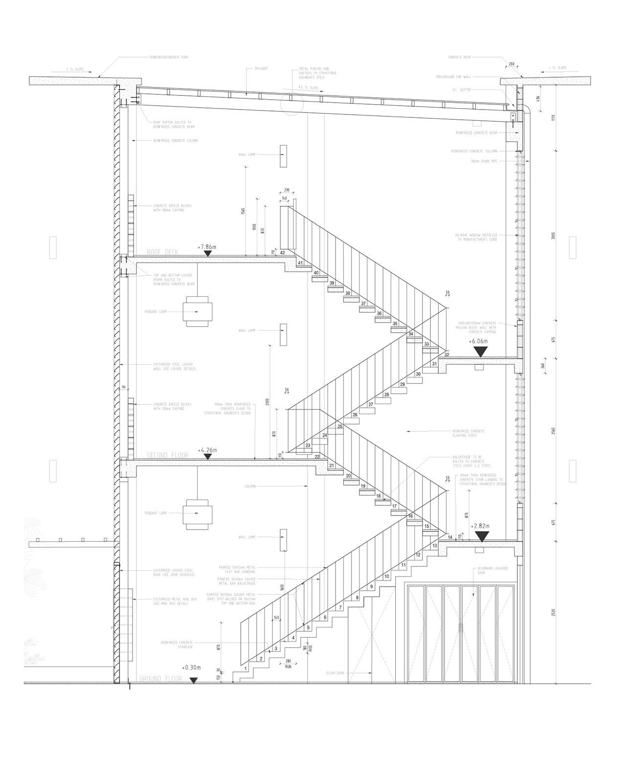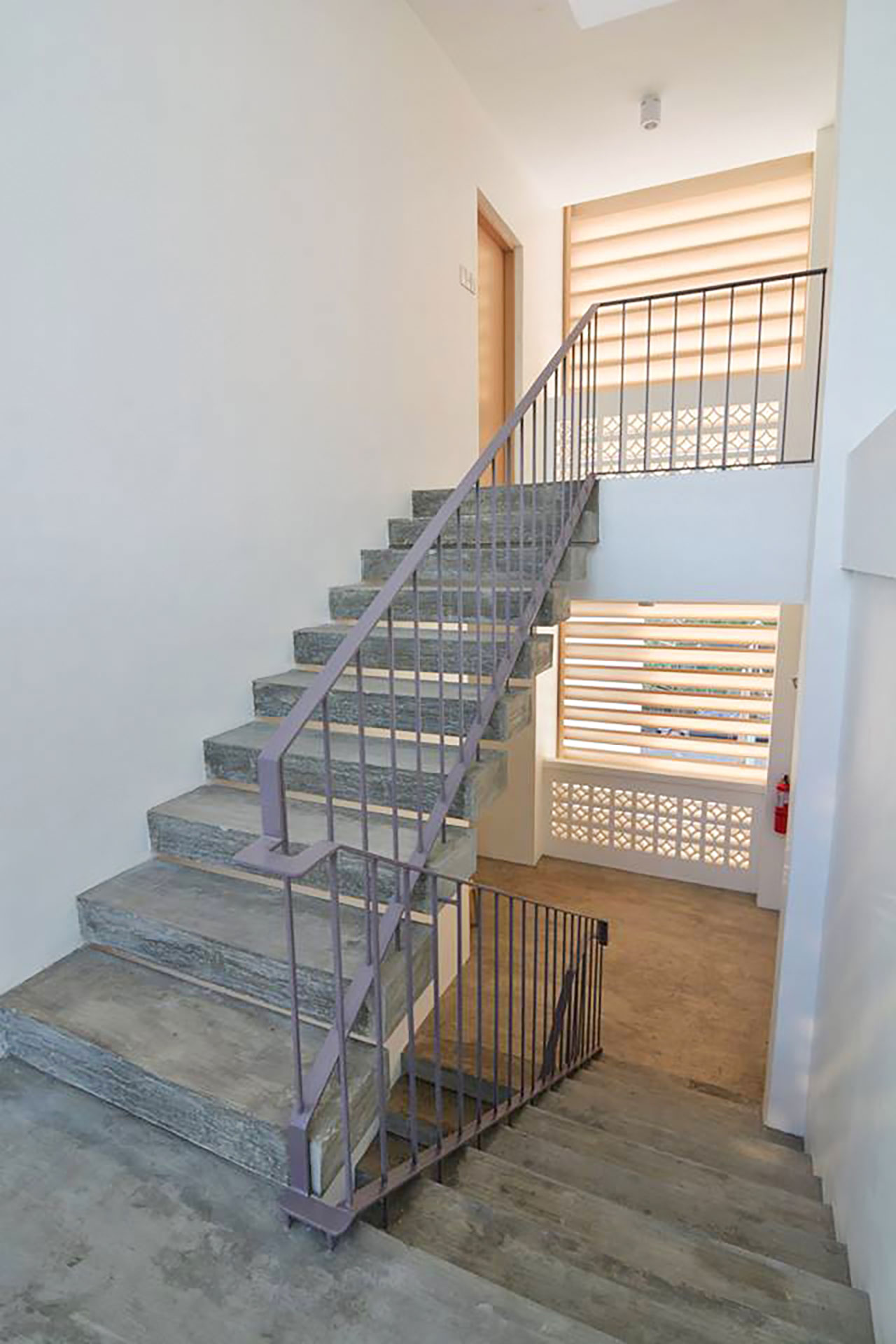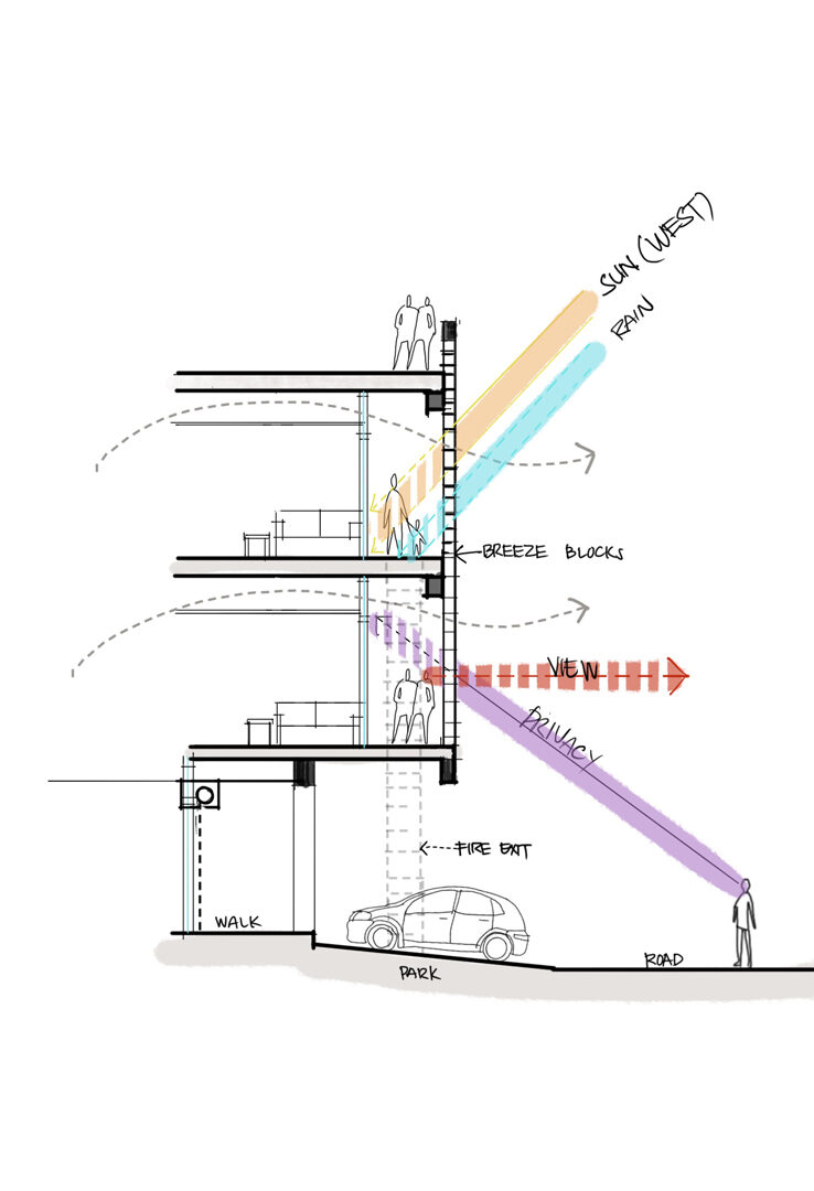 This new screen moderates the intense westerly sun and heavy rainfall while allowing ventilation, filtered views, and privacy to the balconies.