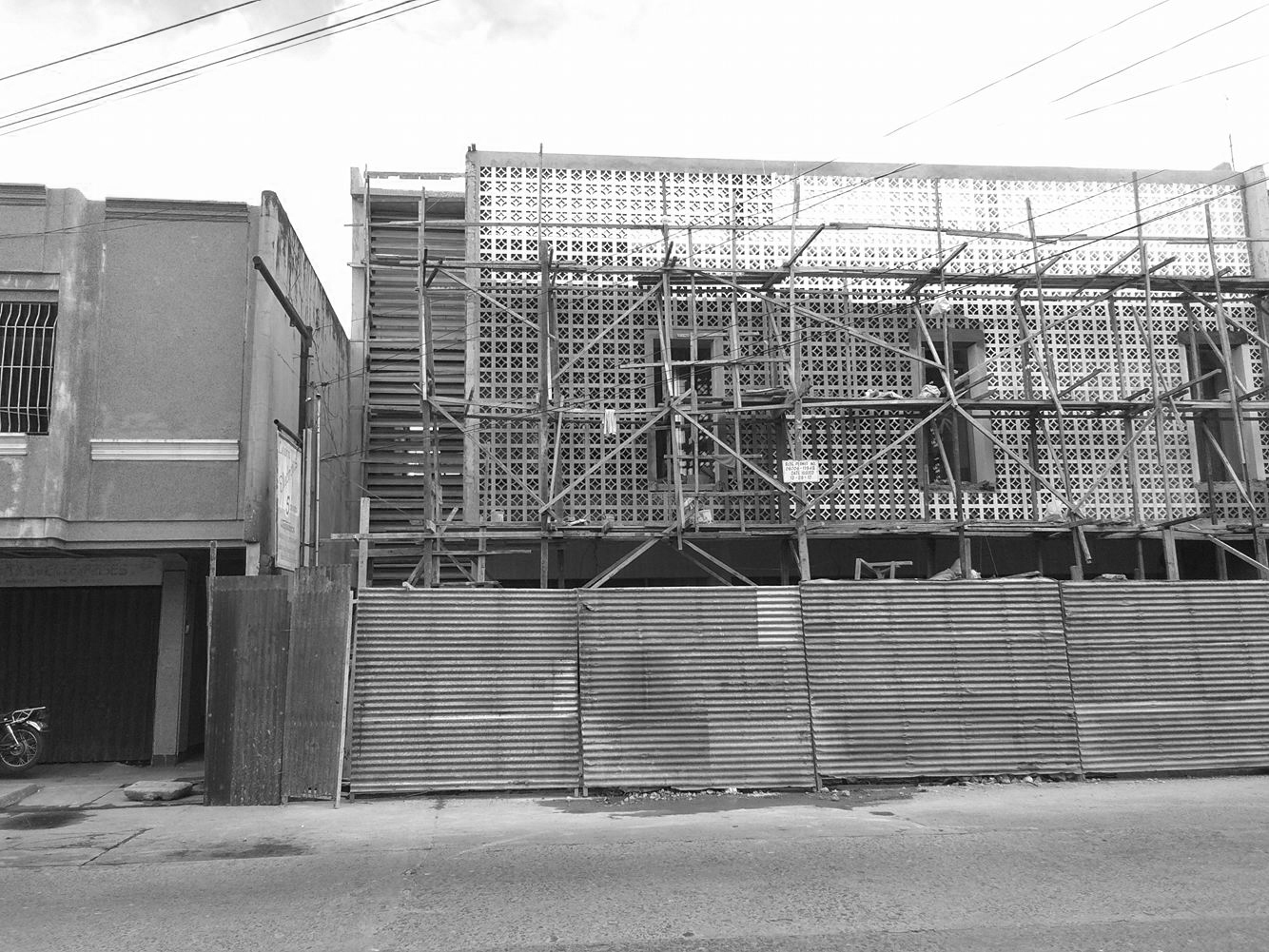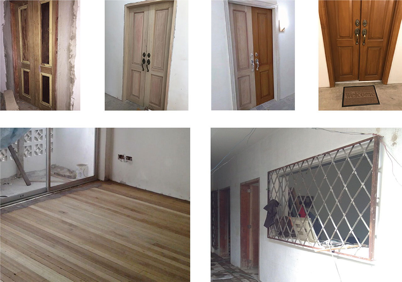 Salvaged timber and galvanized iron roofing were repurposed for construction formwork and hoardings, while existing doors, floorboards and window grills were refurbished and reinstalled, preserving the material memory of the original home.