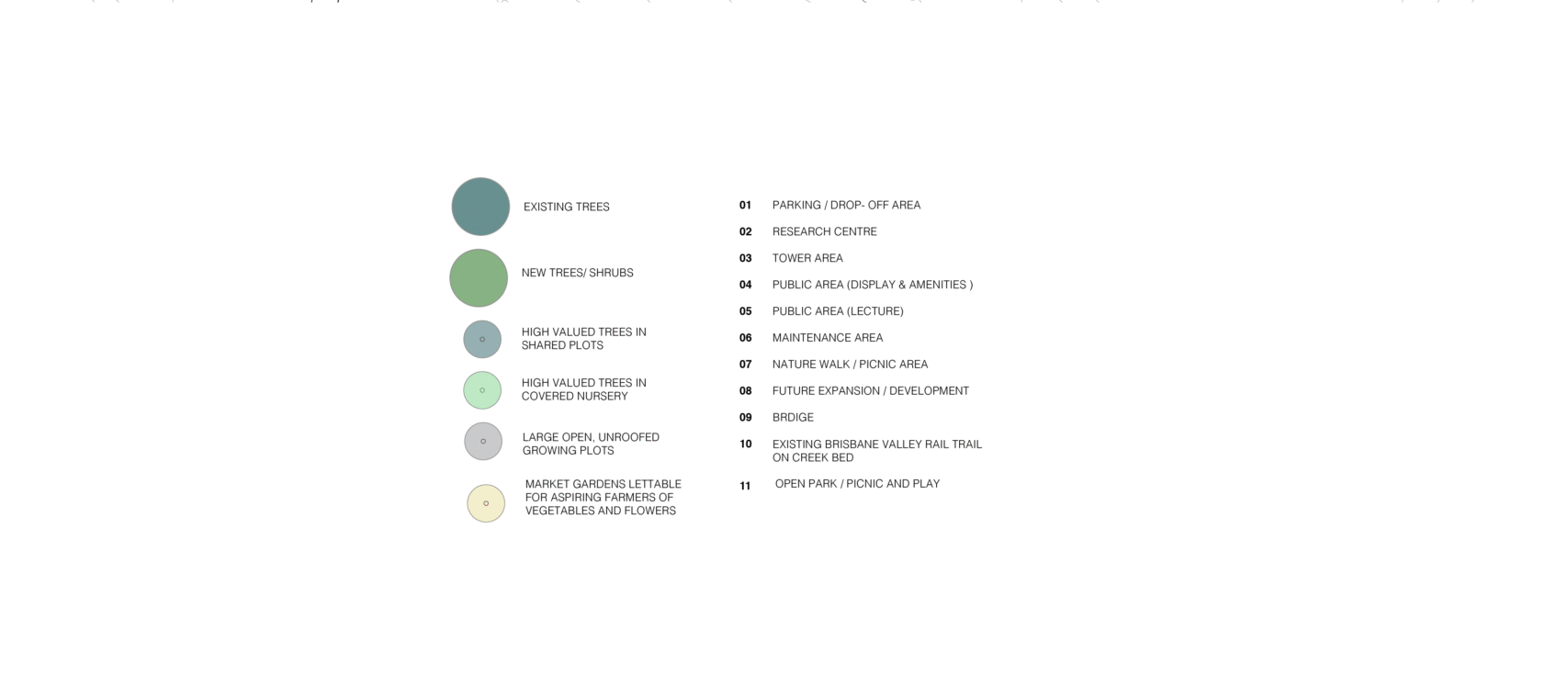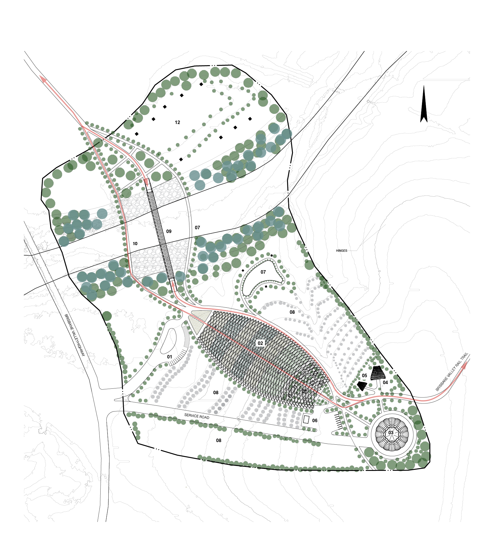 The Brisbane Valley Rail Trail is re-routed to weave through a sequence of structures and landscapes—passing the tower, the public lecture hall, the research centre, and the bridge—transforming the trail into a curated journey. As it threads across terraces, creek edges, and areas of restored vegetation, the trail becomes a generative spine for renewal, deepening the relationship between architecture, Country, and the evolving landscape.