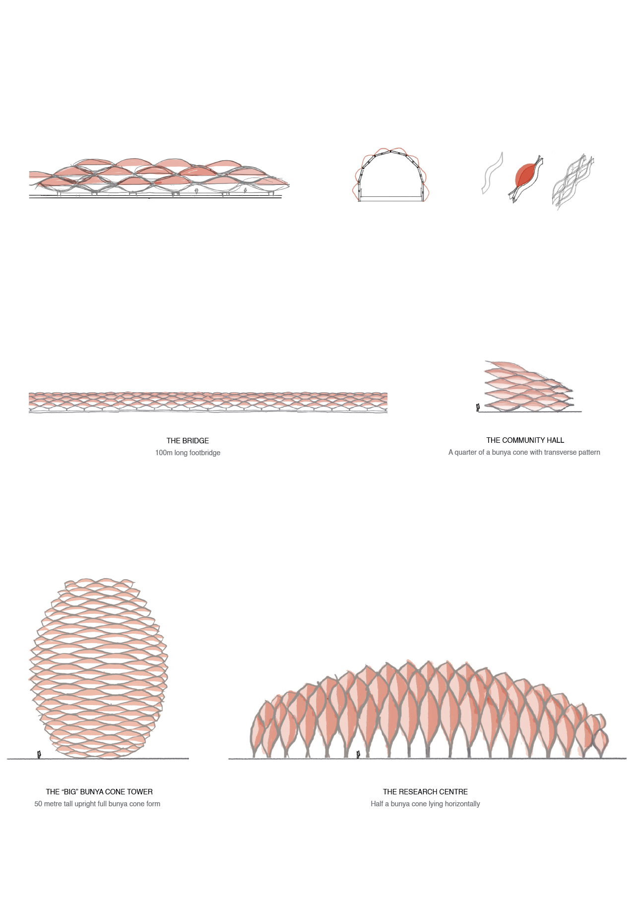 The design draws inspiration from the Bunya nut pilgrimage to the Bunya Mountains—a cultural gathering of renewal and connection that once passed through these landscapes. The anatomy of the female Bunya cone informed a generative system in which a single unit, repeated and adapted, gives rise to structure and form. Each curved element is modular and replaceable, offering opportunities for community engagement in construction and ensuring easy maintenance. This logic shaped the footbridge and extends through the tower, research centre, and community hall.