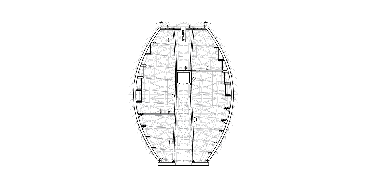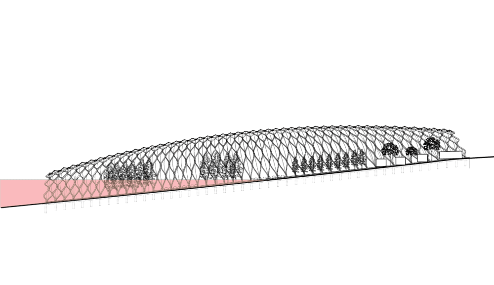 At its centre, a core of eight GLULAM columns rises to support the water tank and four viewing platforms, while a 30 m high slippery dip spirals down, offering a playful, exhilarating descent. Wrapping around the core is a spiral ramp leading visitors upward, framed by sixteen GLULAM columns and segmented polycarbonate panels that curve and bend in a smooth, dramatic way, visually guiding the eye around the tower and emphasising its organic form.