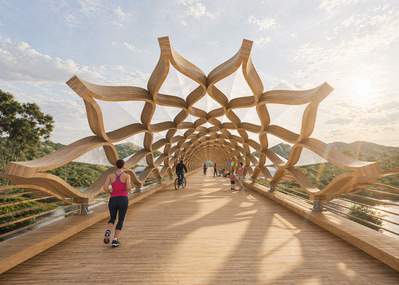 The geometry of the Bunya cone is sectioned into a half-cylinder, reoriented to site conditions, and extended longitudinally to accommodate spatial requirements, generating the bridge canopy.