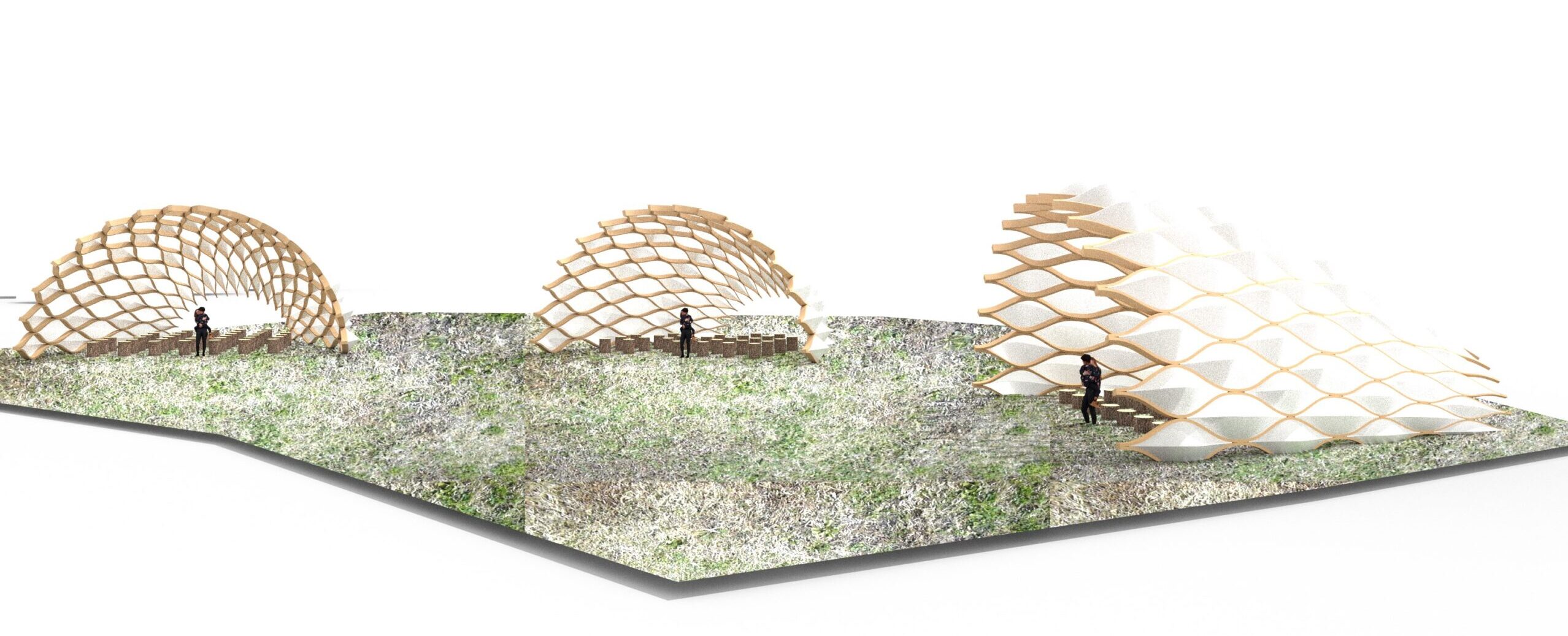 Unlike algorithm-driven generation, the process unfolded through imagination, hand sketching, and experimental explorations in Rhino 3D, allowing intuition and iteration to guide the form-finding journey. Through this hands-on approach, the design embodies continuity and regeneration—where repetition becomes growth, and structure emerges from nature’s own patterns. The project was further refined in collaboration with civil engineering students, blending experimental design with structural testing and scientific inquiry.