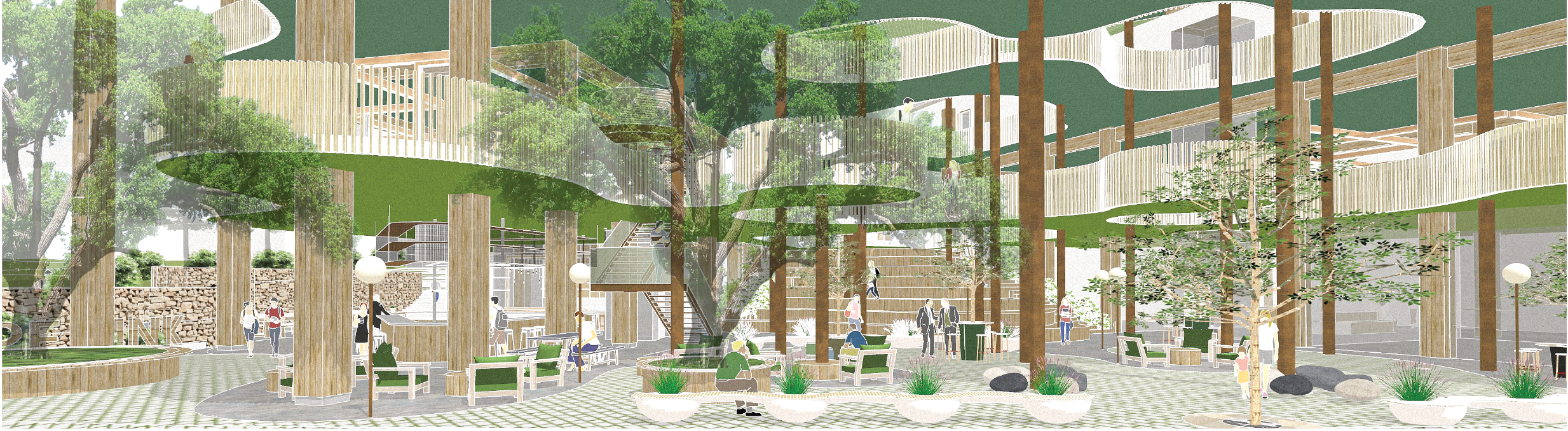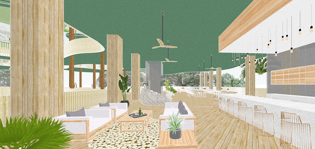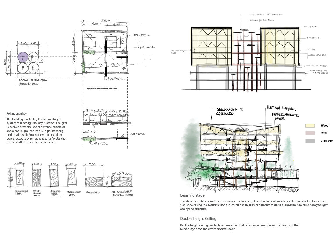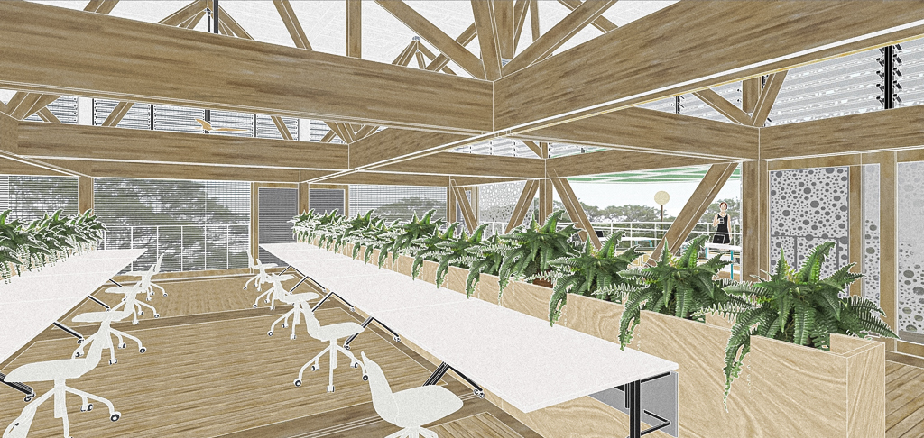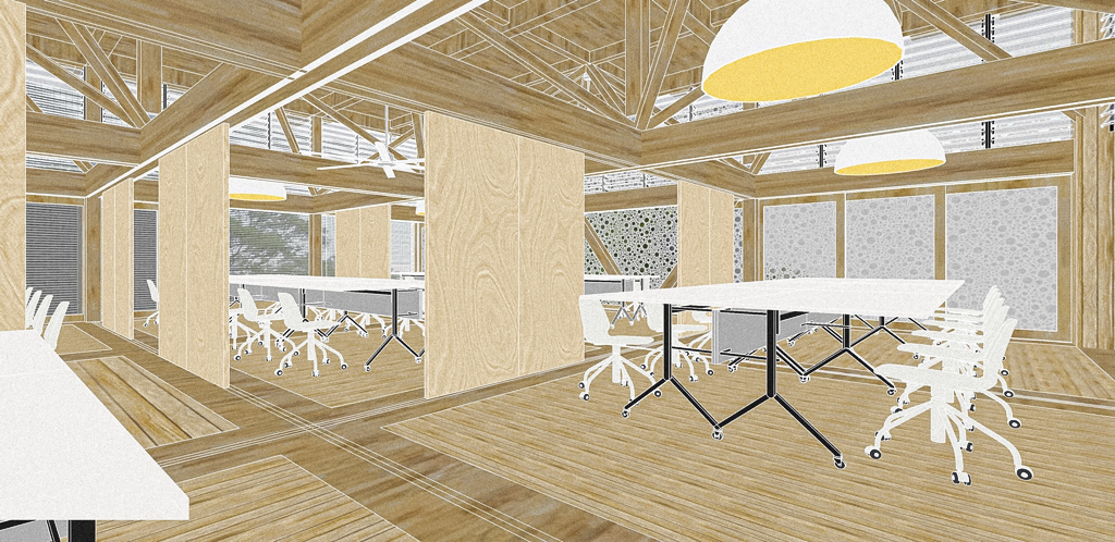 The design of the building prioritises connectivity and adaptability, fostering a seamless exchange of ideas and movement for users of all ages—students, staff, and the broader community. Featuring concrete for the first three levels and wood (CLT and GLULAM) for the succeeding levels, the structure maximises natural light through a perforated facade.