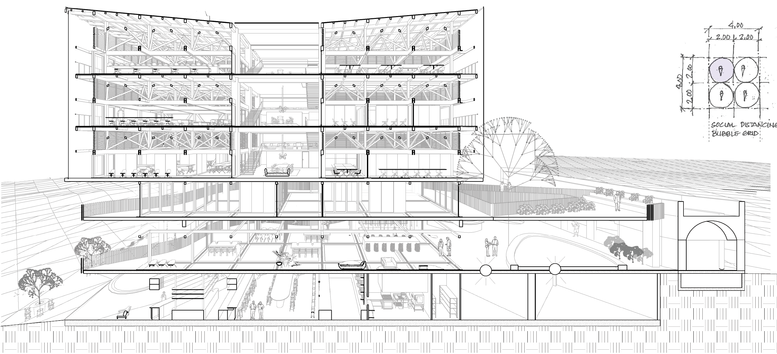 Highly flexible grids for social distancing (2 metre bubble) allow for easy reconfiguration of the space. Solid, glass, or screen doors, movable walls and planters are slotted and slid between the space truss and the floor. The building serves as a dynamic canvas, with an LED media mesh facade that can be curated by digital artists, showcasing announcements, advertisements, scenic views, and movies.