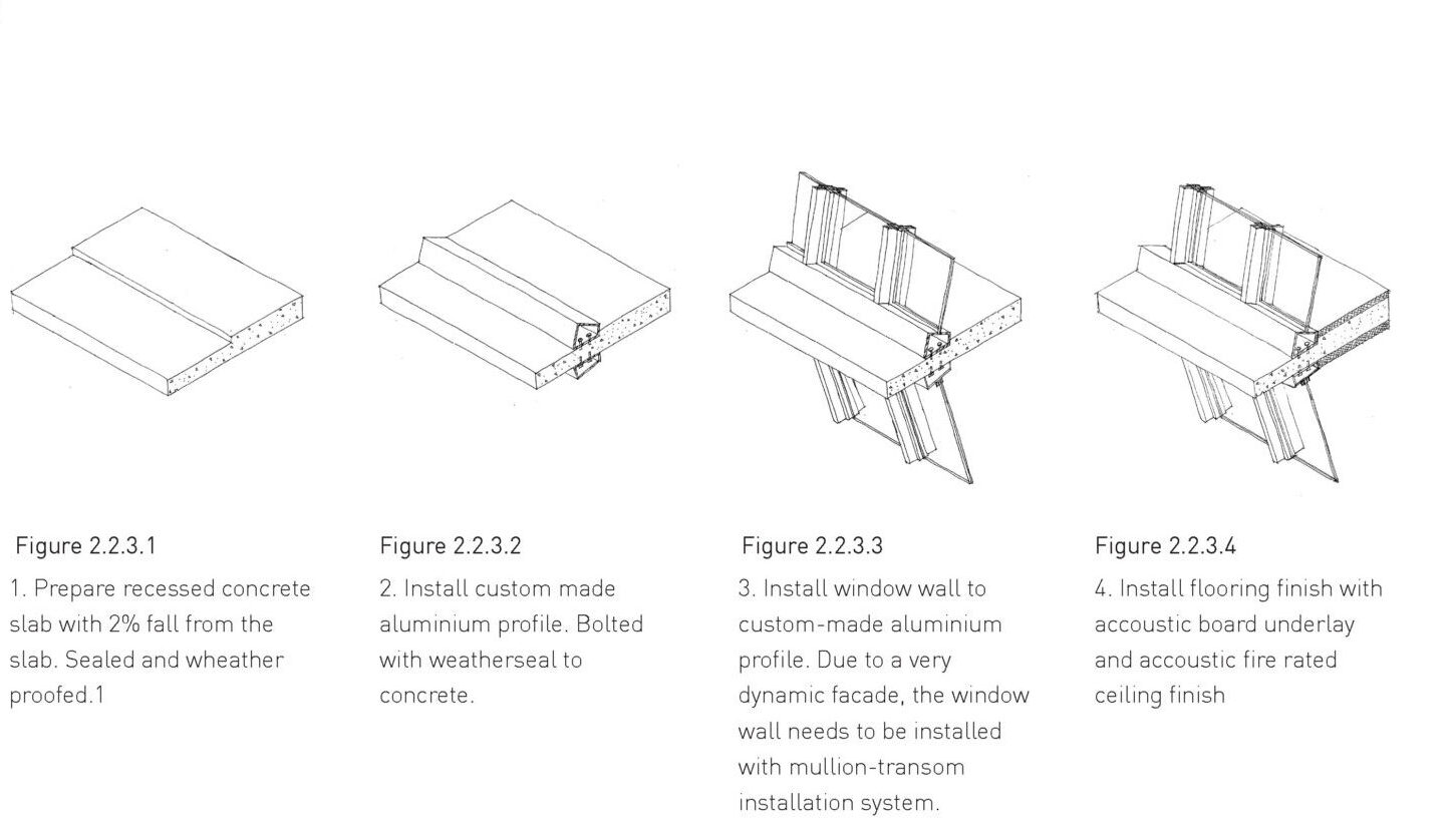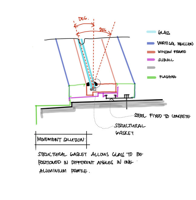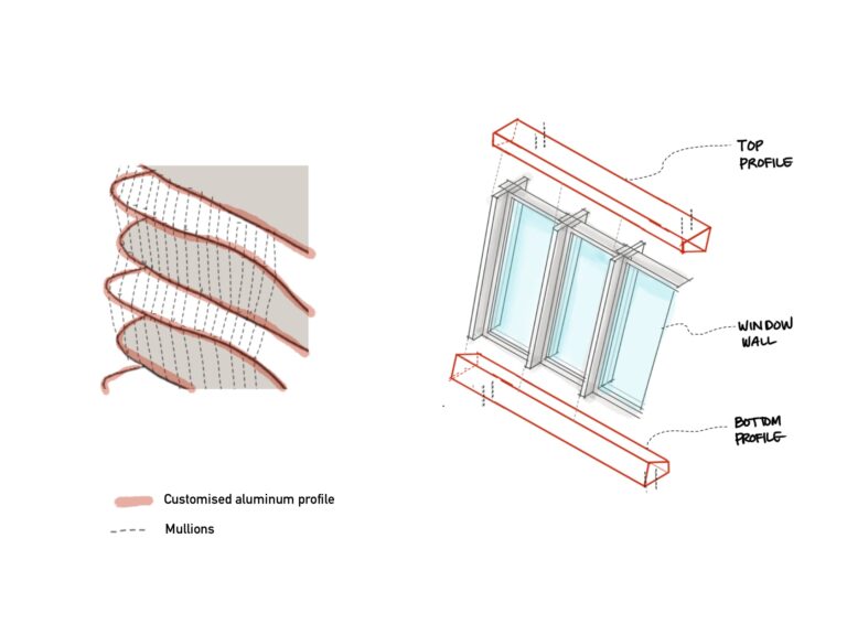 During technical analysis, the customised sill profile required redesigning to prevent water accumulation. Additionally, the movement capacity of the original window wall system proved insufficient to achieve the intended façade undulation, and a stick-built installation was assessed as too time-consuming and labour-intensive.