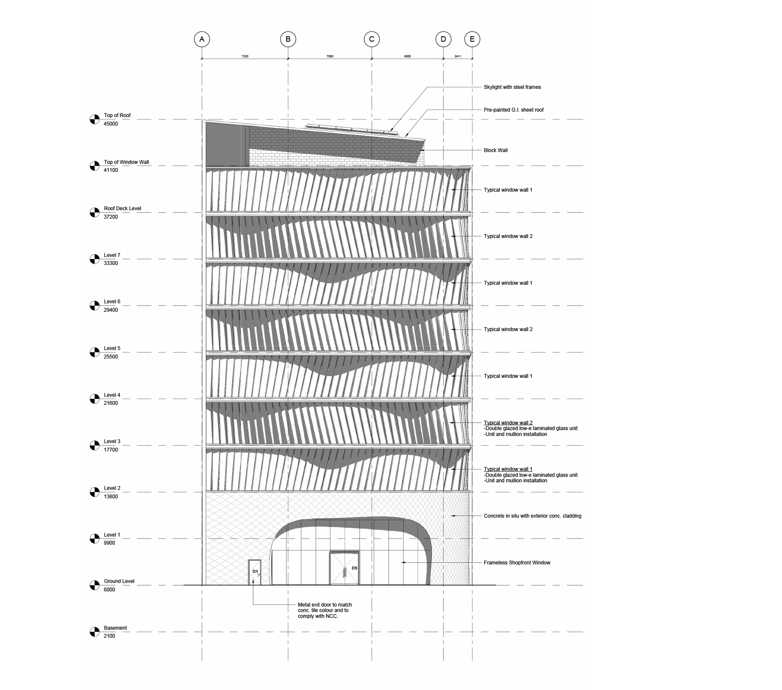 To address these challenges, a sub-sill was introduced, and the façade strategy was reconfigured using prefabricated window panels installed between deeper vertical mullions. These mullions allow each panel to be offset and rotated independently, enabling the required angles of slant. This approach achieves the desired undulating façade expression without the need for curved glass, maintaining both constructability and design intent.