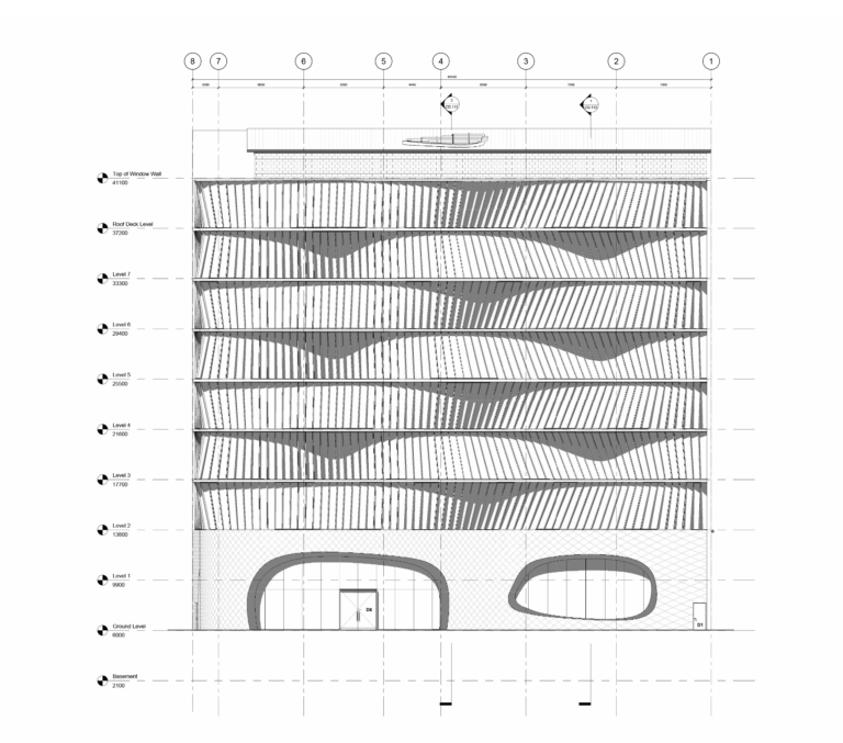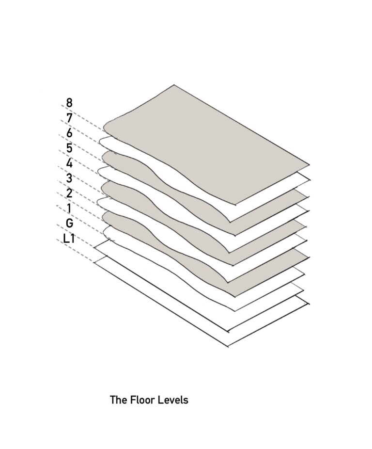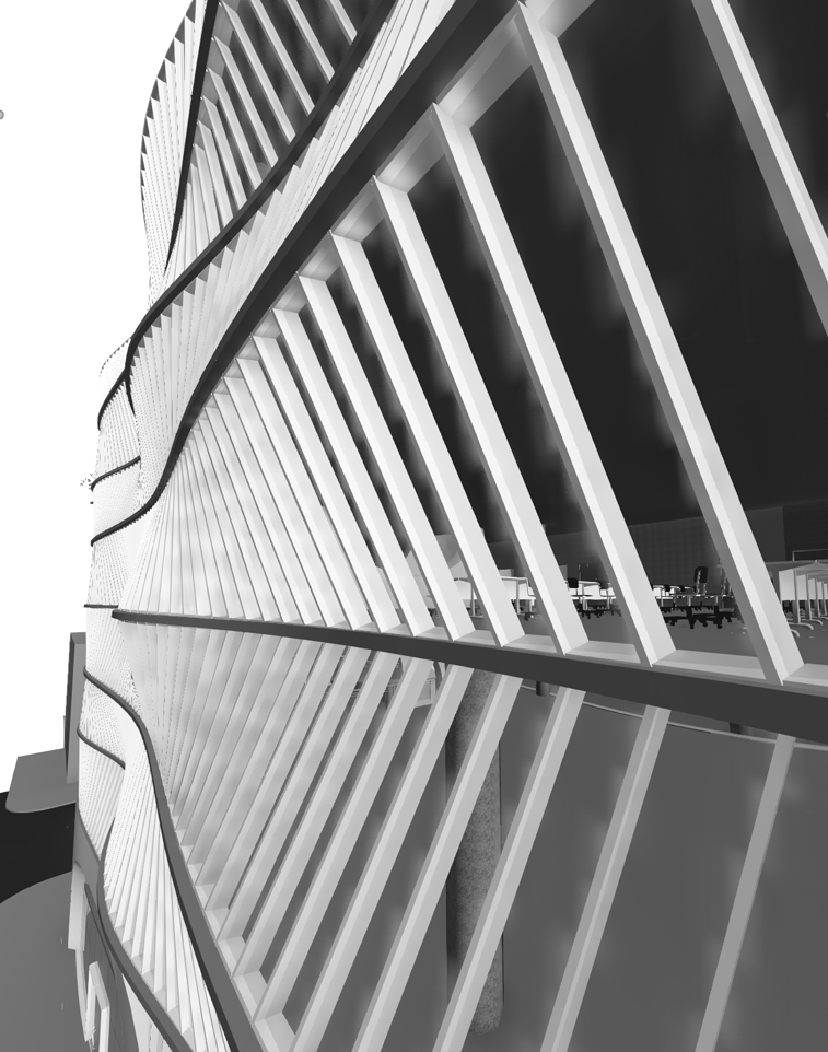 The building floors are sinuous, directing the rhythm of the facade. Alternately curving throughout the height of the building, the facade undulates and interacts with the natural light that appears to be constantly moving throughout the day.