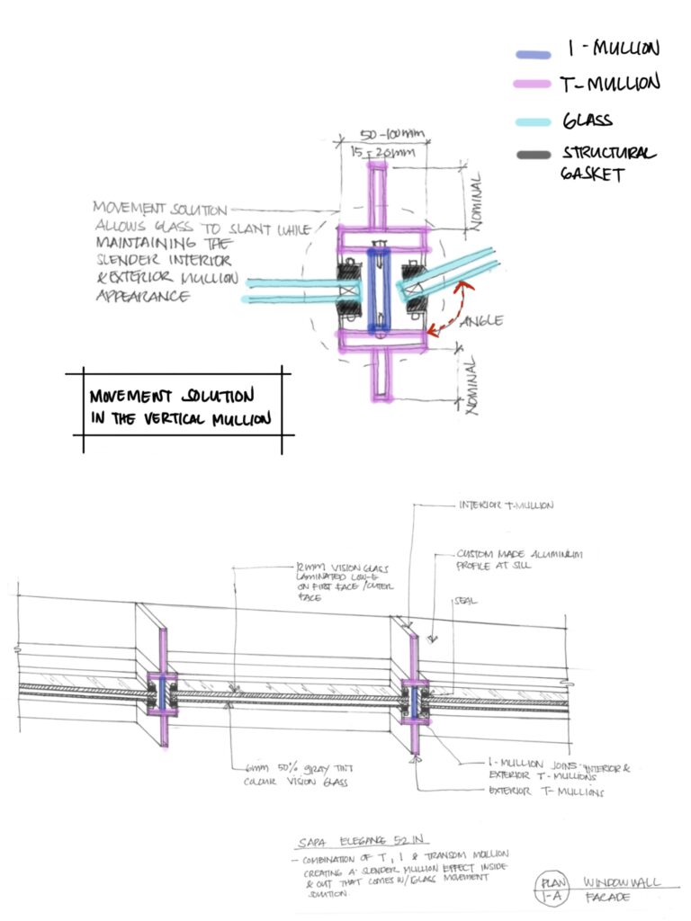 One of my role in this project was to develop the façade system. The design began with a window wall assembly using the SAPA Elegance 52 IN system, set between customised aluminium head and sill profiles along the slab edges. The SAPA system employs slender ‘I’ and ‘T’ mullions that provide both structural clarity and movement capacity. This configuration enables flat glass panels to be positioned at varying angles using a standard frame profile, offering flexibility and a refined façade rhythm.
